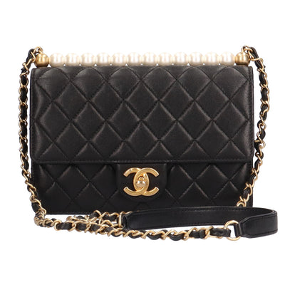 シャネル CHANEL パールチェーンショルダー マトラッセ ショルダーバッグ ラムスキン ブラック レディース 中古