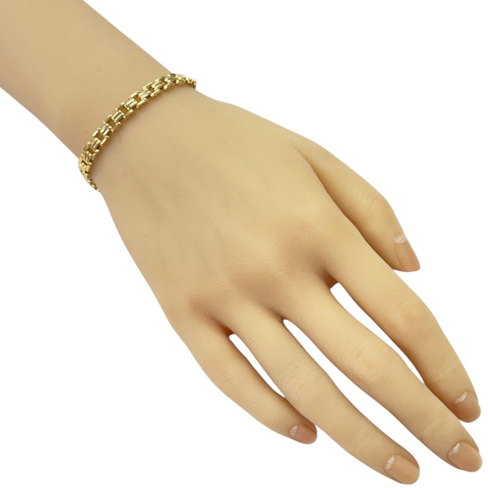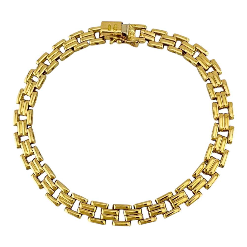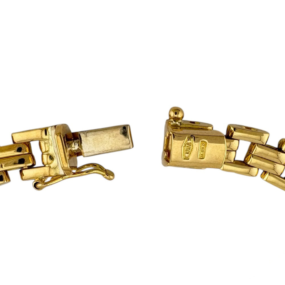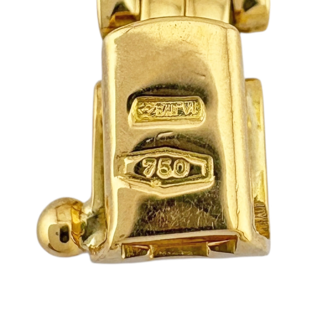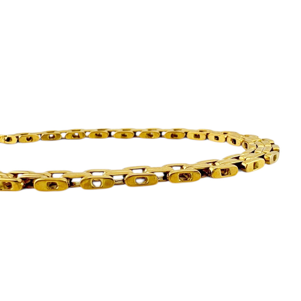 K18イエローゴールドの洗練されたフラットチェーンが、手首に沿ってしなやかに輝くエレガントなブレスレットです。 シンプルながらも存在感のあるデザインで、お手持ちのジュエリーとの重ね付けにも最適です。