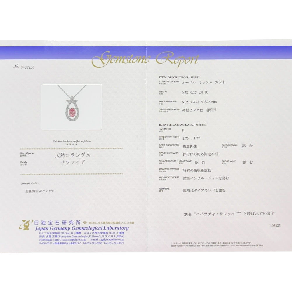 | 材質(石) | パパラチアサファイア(約0.78カラット) / ダイヤモンド(約0.17カラット) |