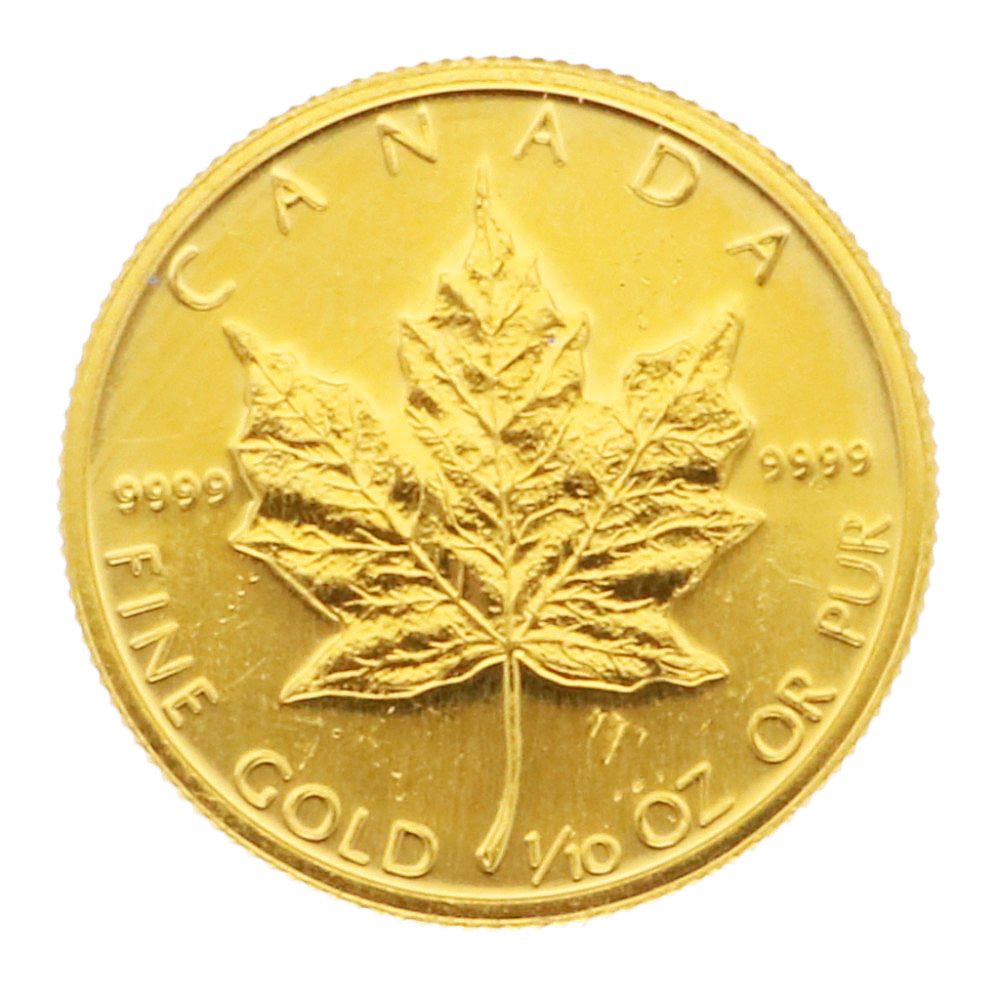 This is a 1/10 oz Maple Leaf gold coin issued by Canada.