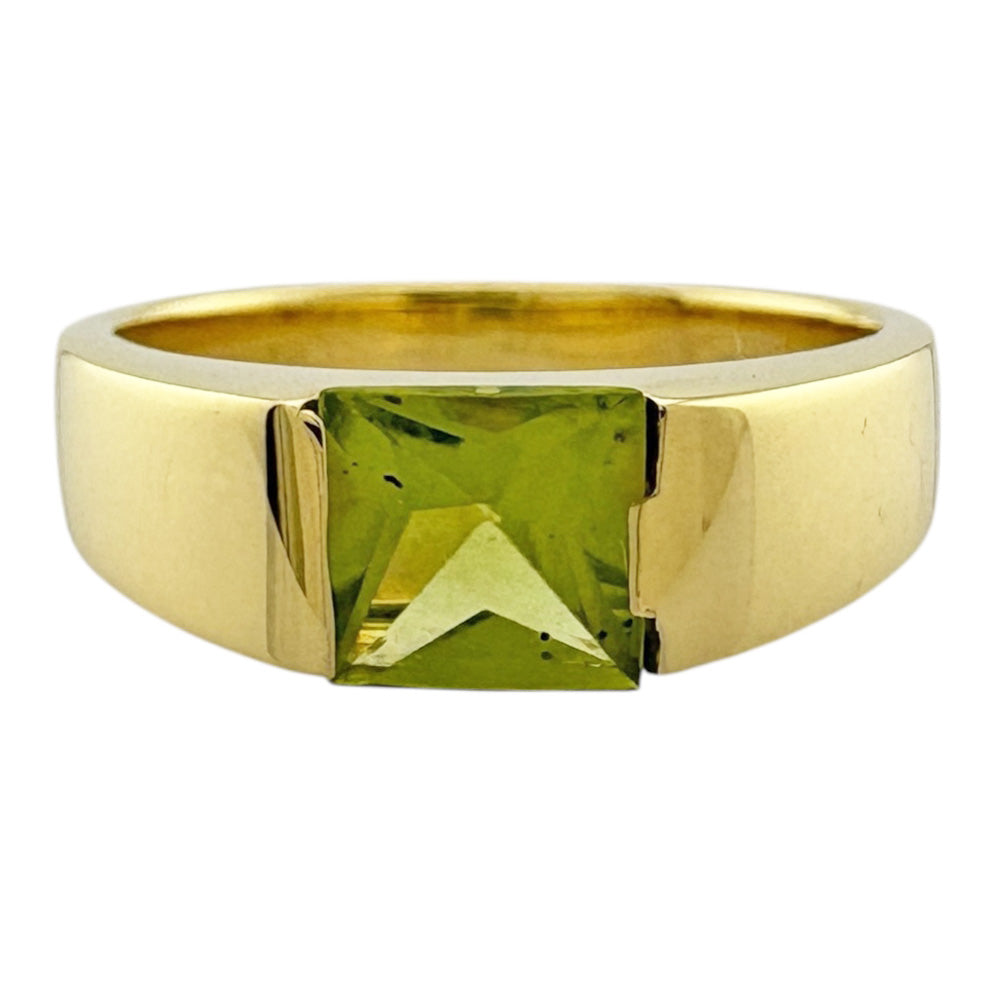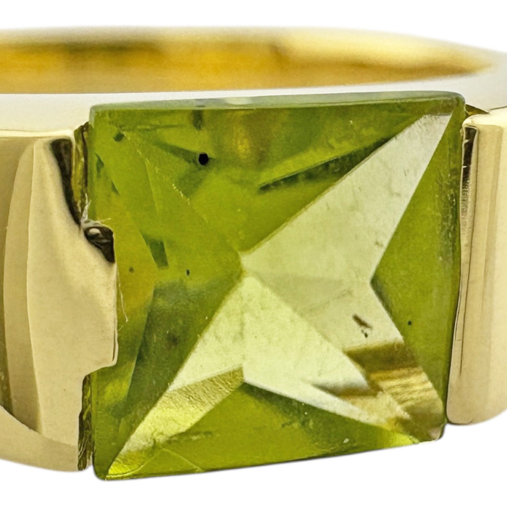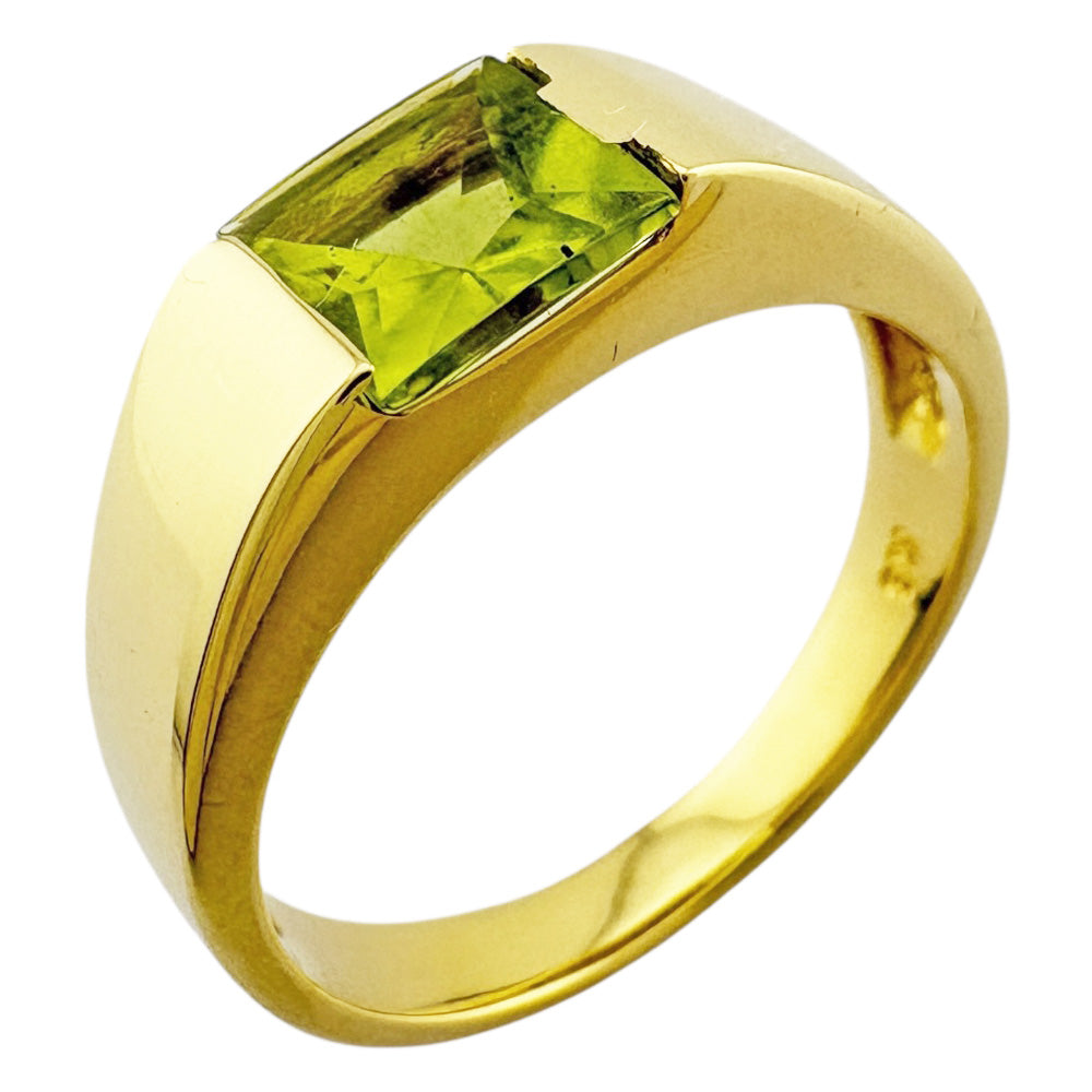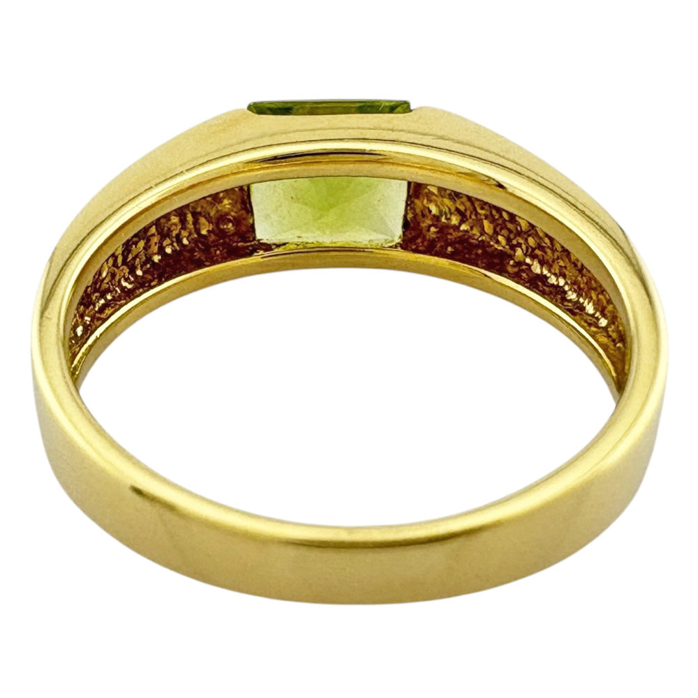 This ring features a vibrant yellow-green peridot that stands out against the sparkle of the 18 K yellow gold. The simple yet distinctive design brightens up your fingertips and enhances your individuality.
