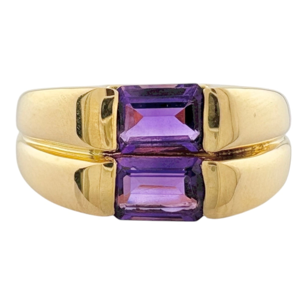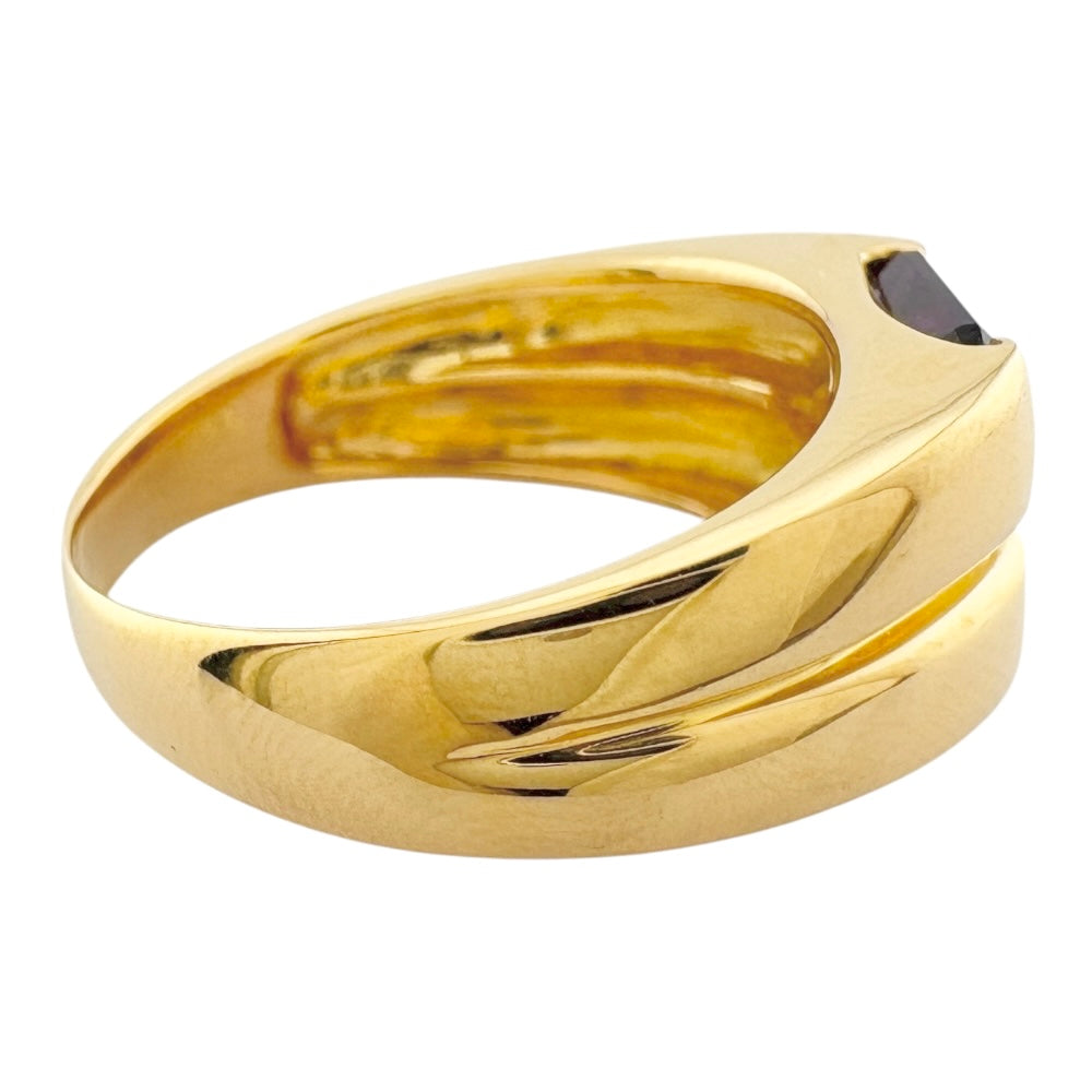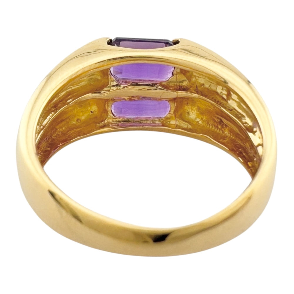 A 18 K yellow gold ring with a bold vibrant amethyst. The contrast between glossy gold and deep, noble purple will add a modern and unique touch to your hands. With its stylish design, this item brings out the charm of adults.