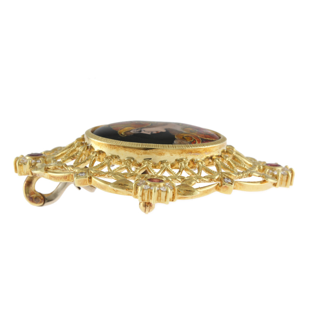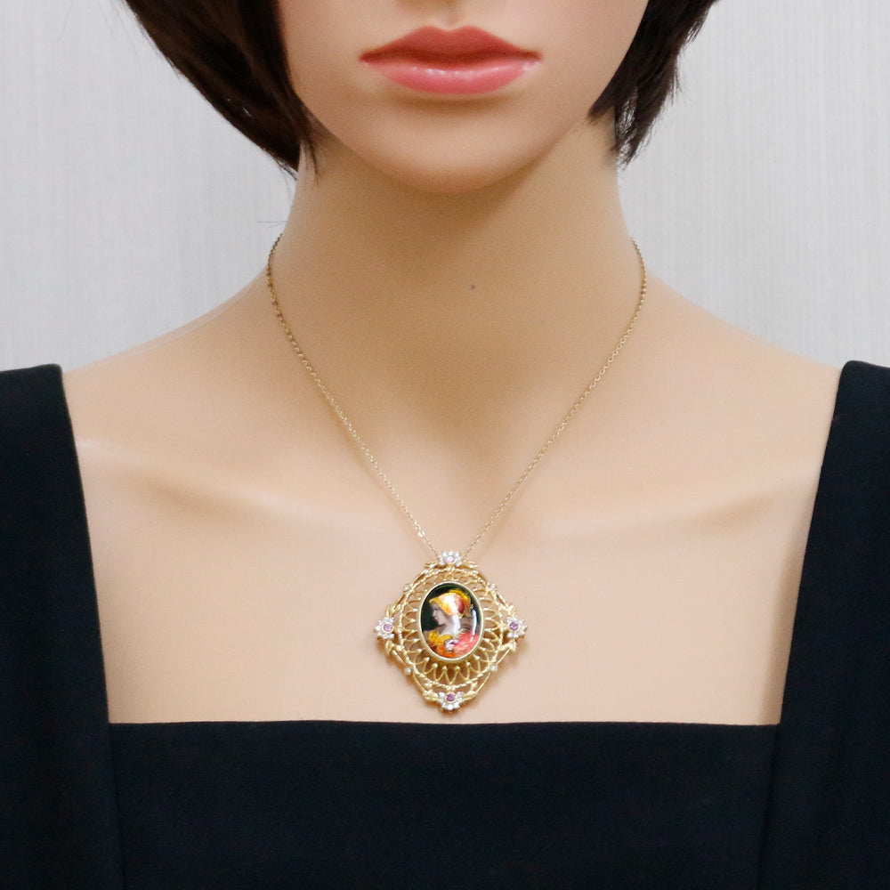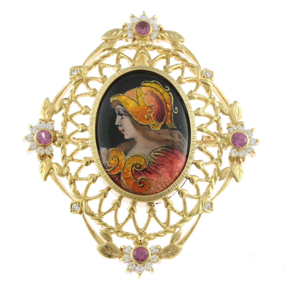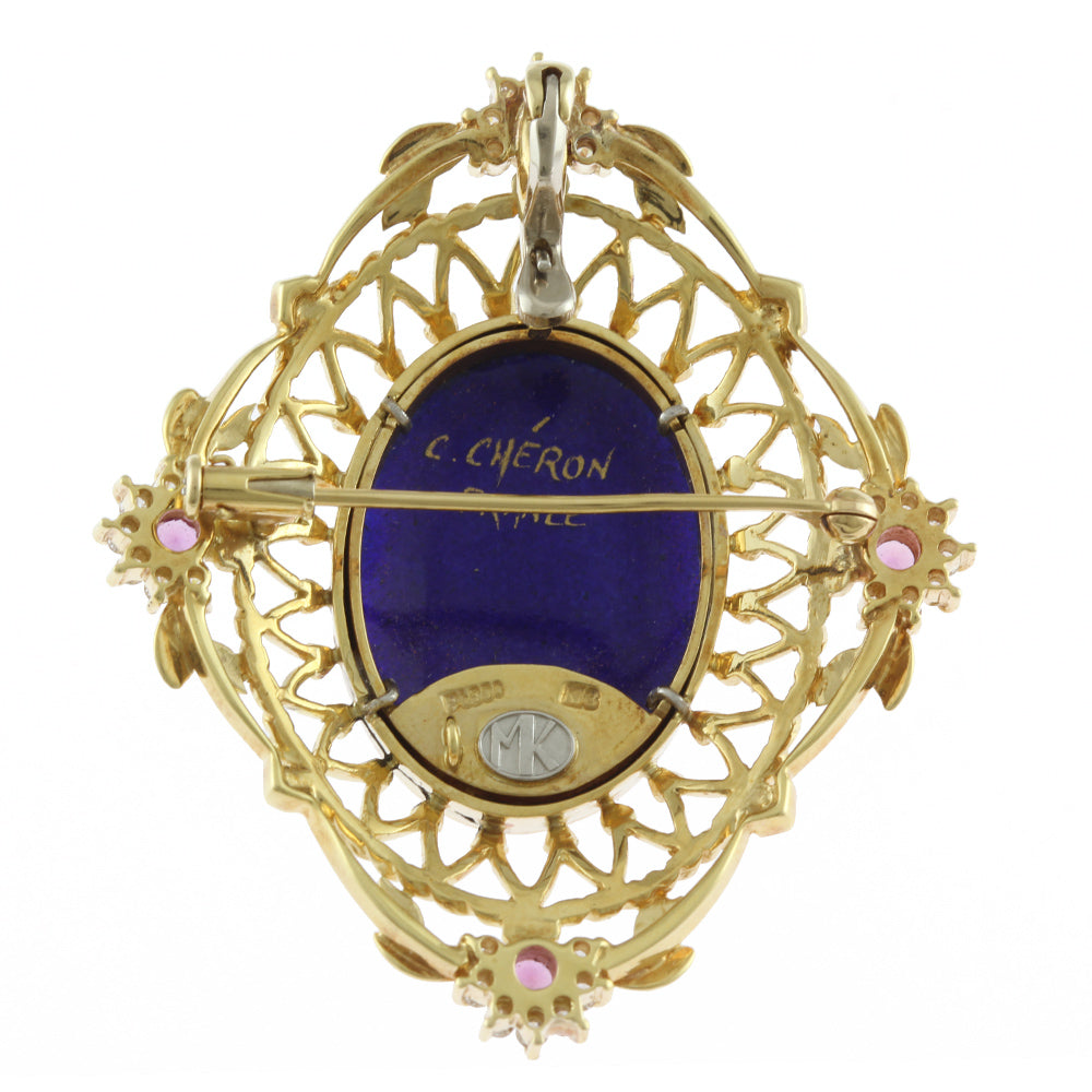 [Artist] Mitsuo Kaji Enamel Pendant Brooch 18K Yellow Gold Pink Sapphire Diamond Women's Used