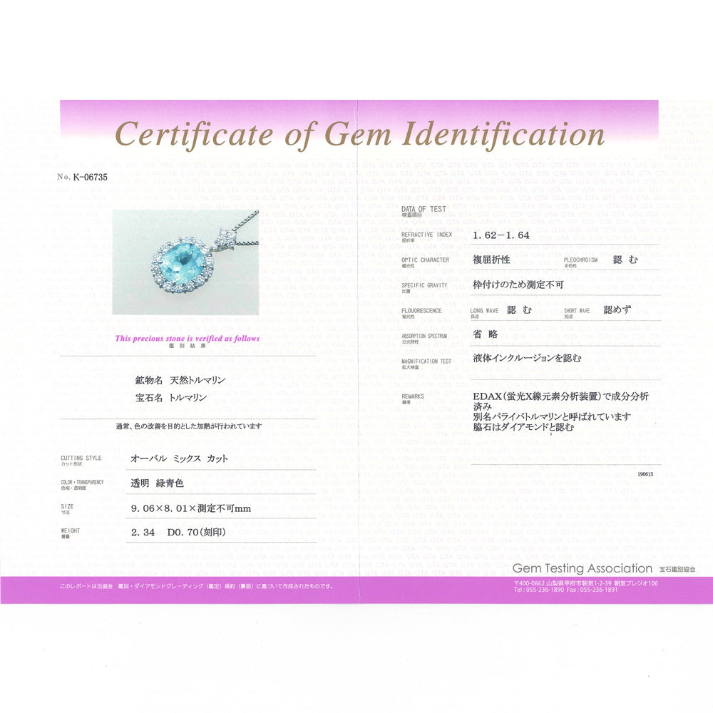 | 材質(石) | ダイヤモンド 19石(約0.7カラット) / パライバトルマリン 1石(約2.34カラット) |