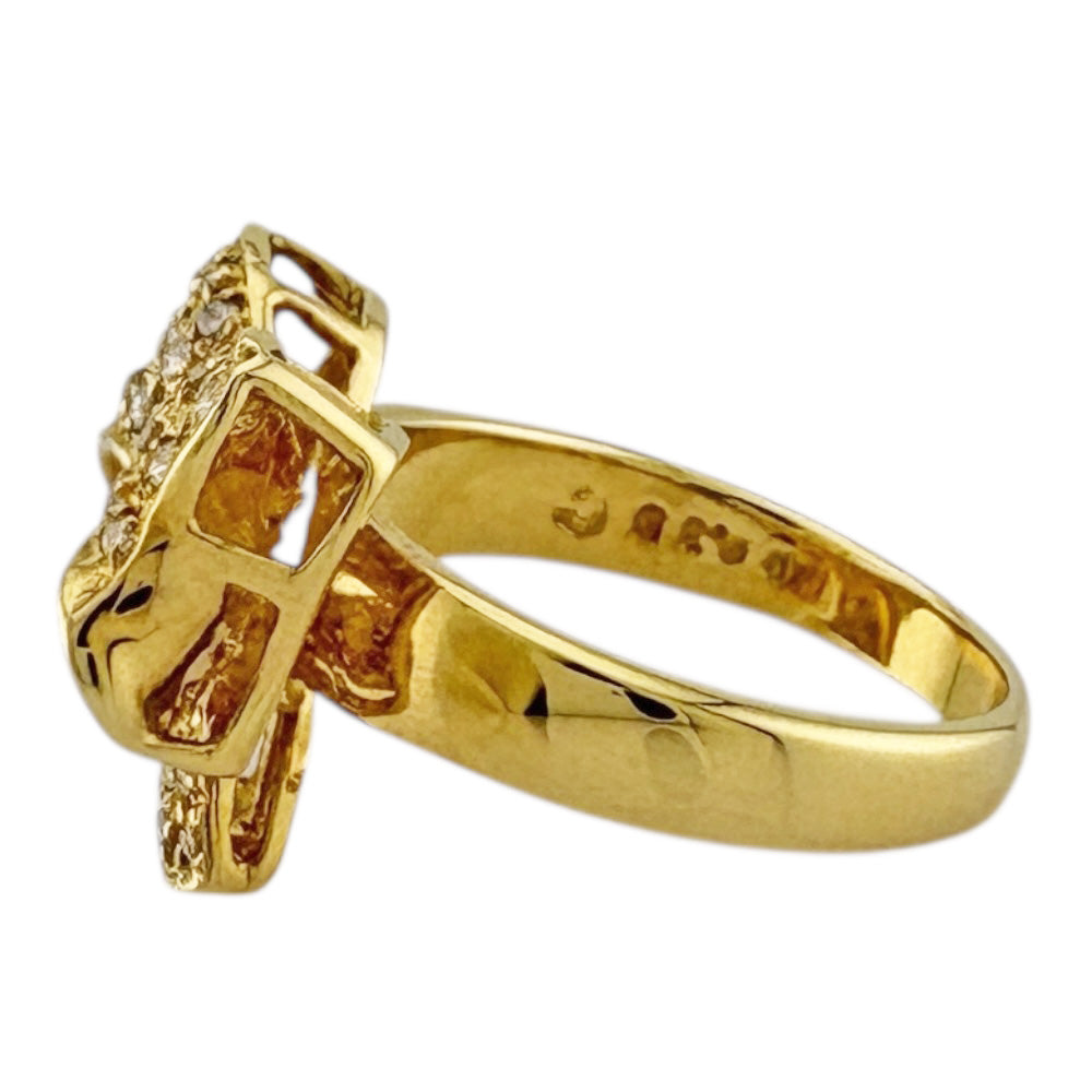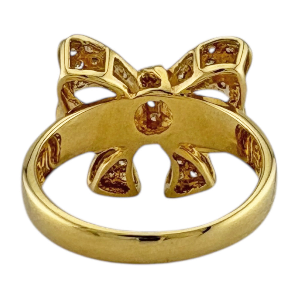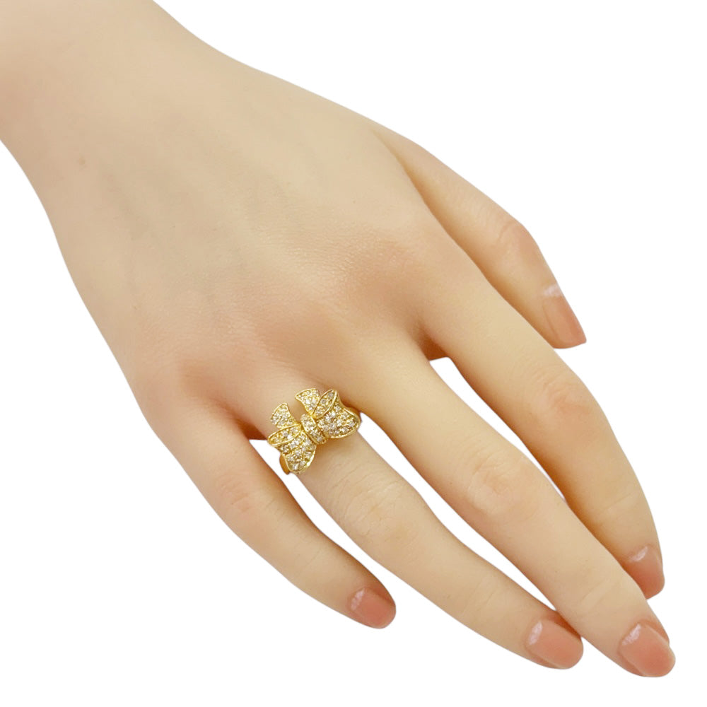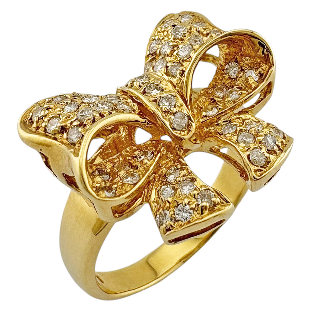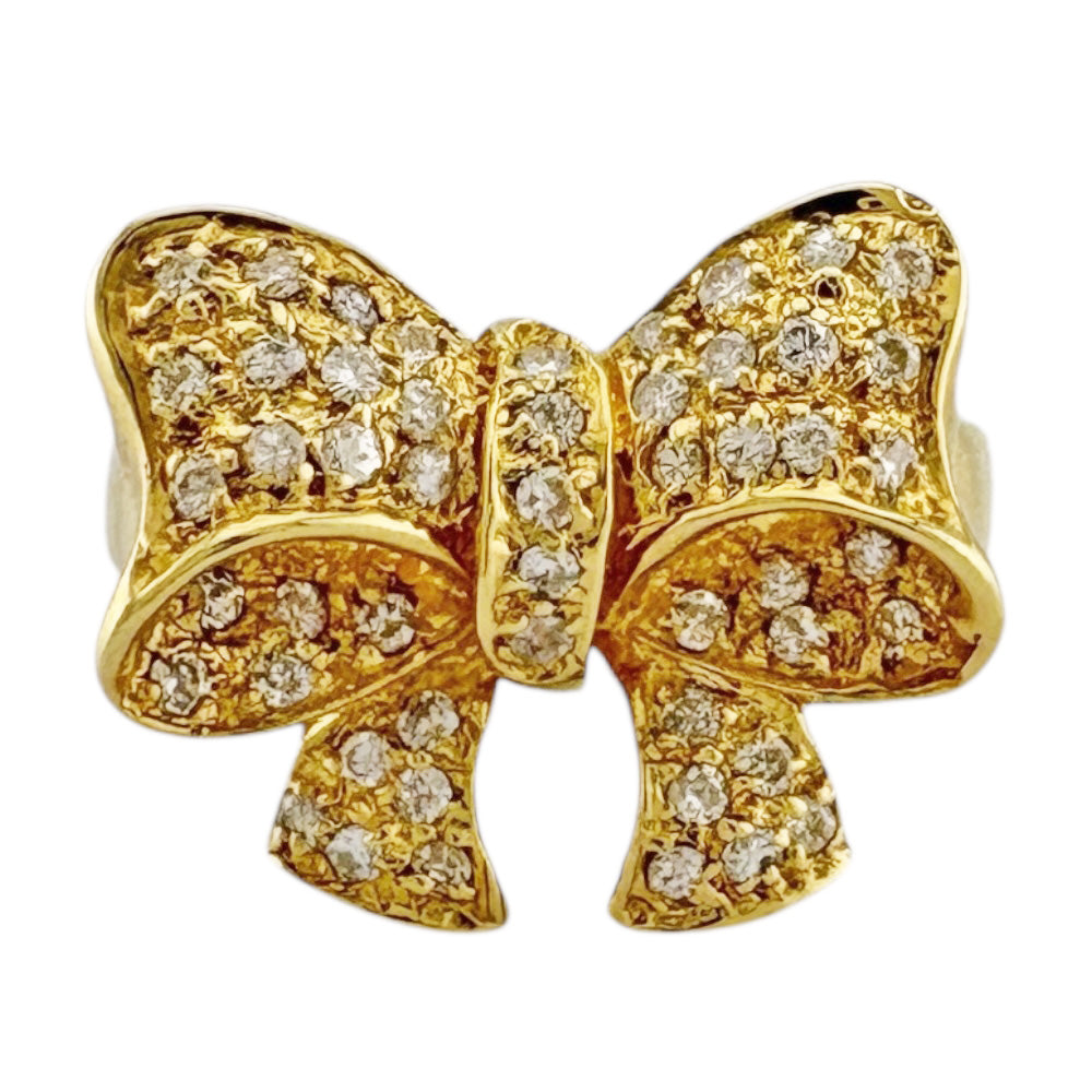 煌めくダイヤモンドを贅沢に敷き詰めた立体的なリボンモチーフが、指元に華やかさと愛らしさを添えるリングです。18金イエローゴールドの輝きが、手元を一層輝かせます。