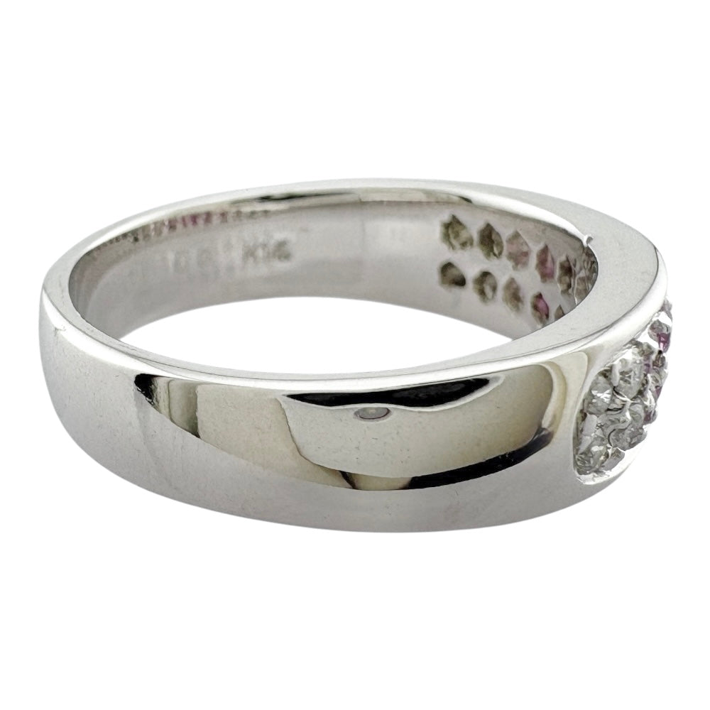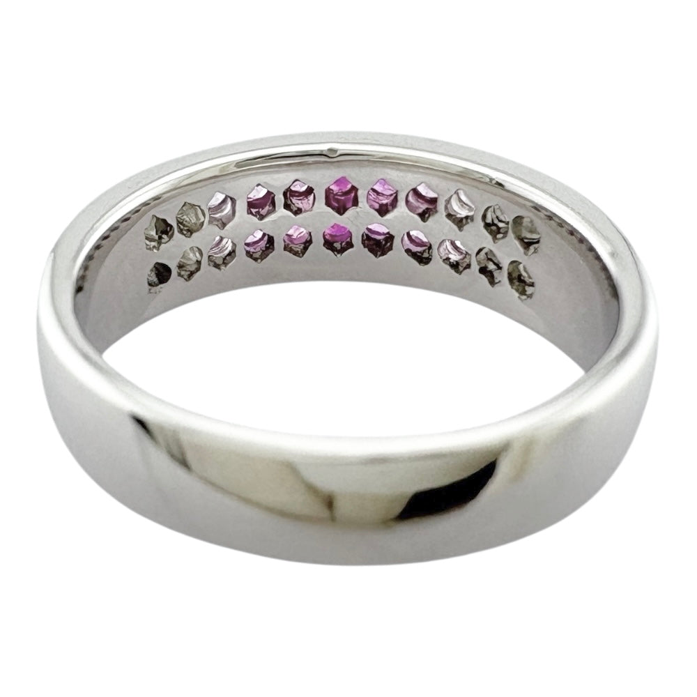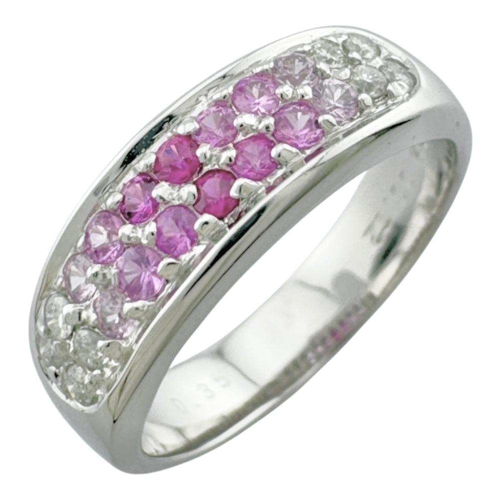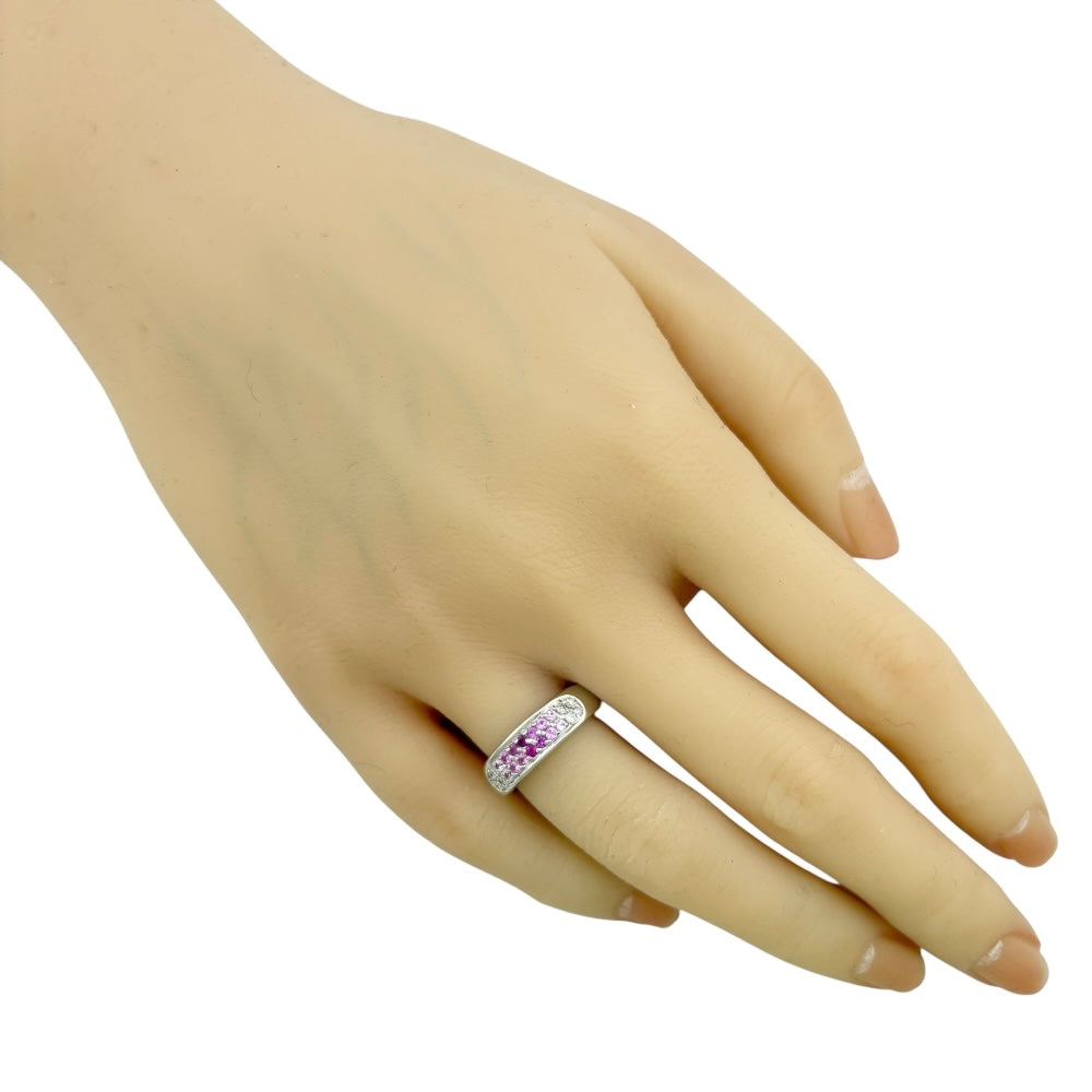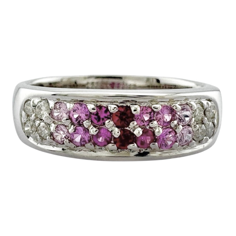 グラデーションカラーのピンクサファイアとダイヤモンドが美しく輝く、個性的なリングです。かわいらしさと上品さを兼ね備えたデザインで、指元を華やかに彩ります。