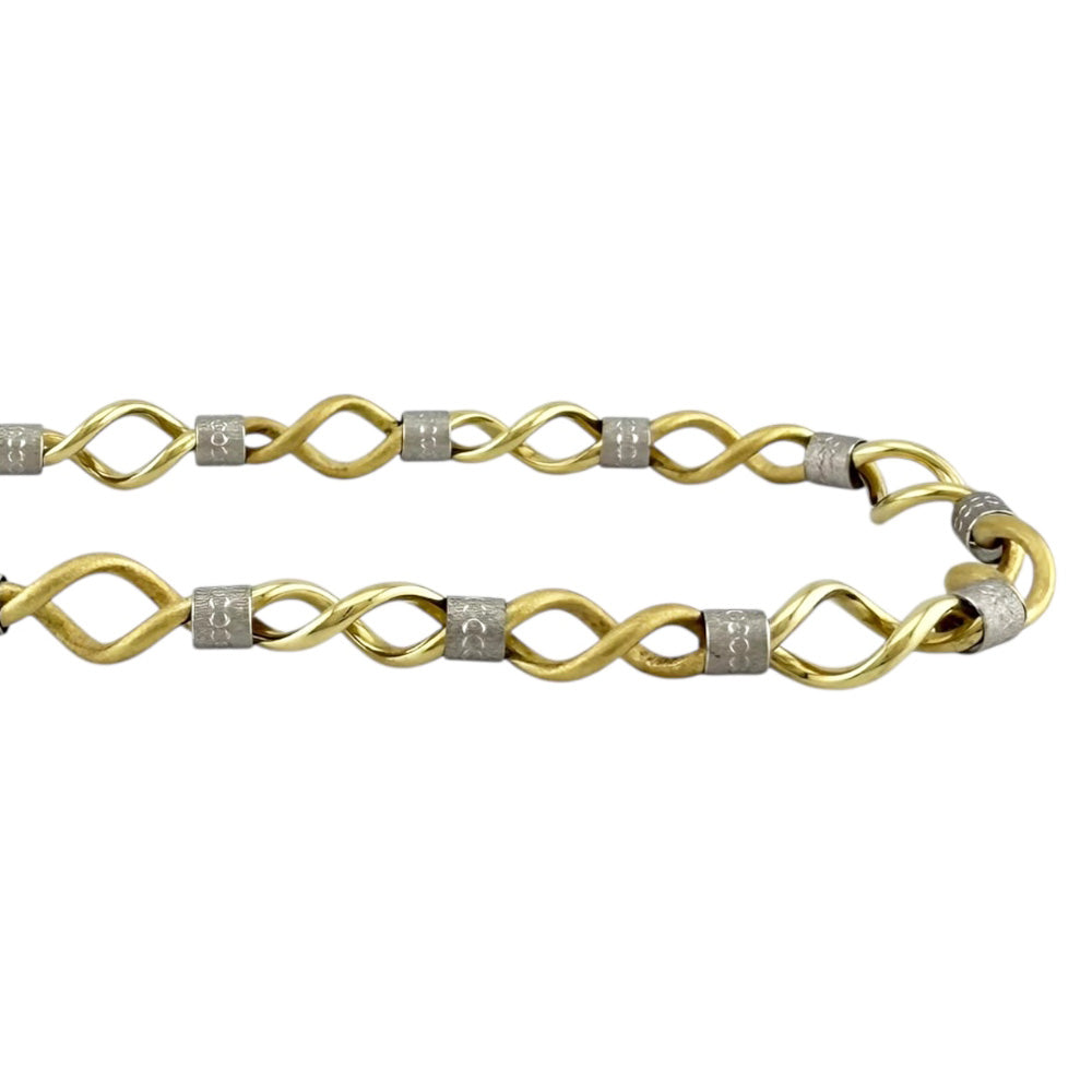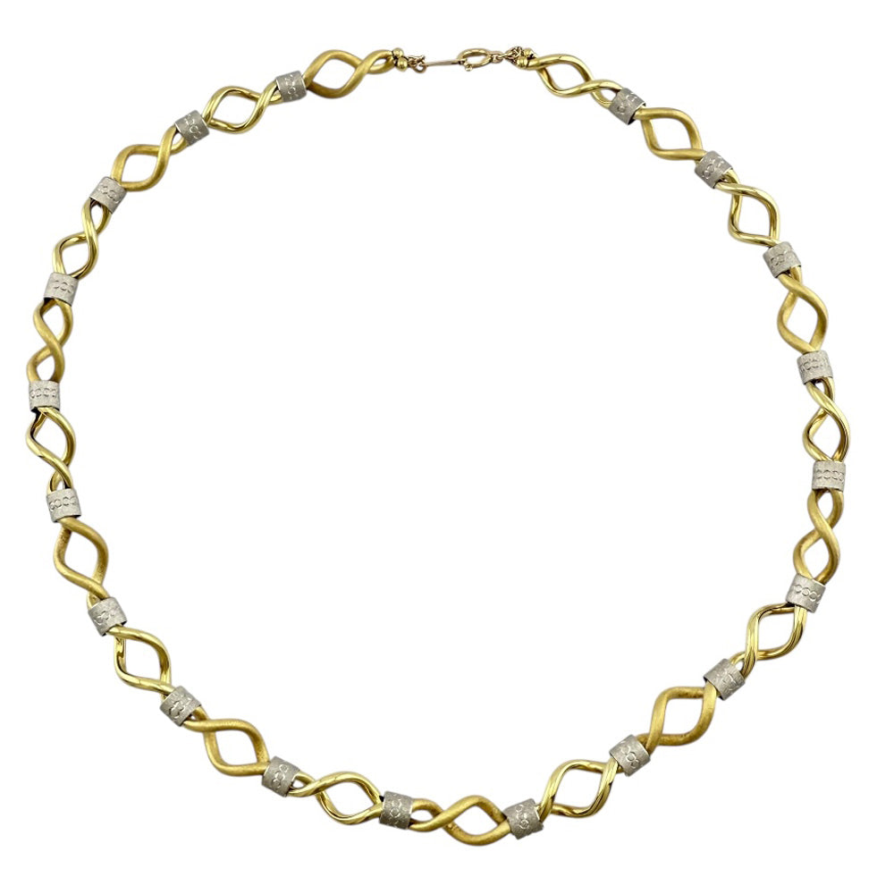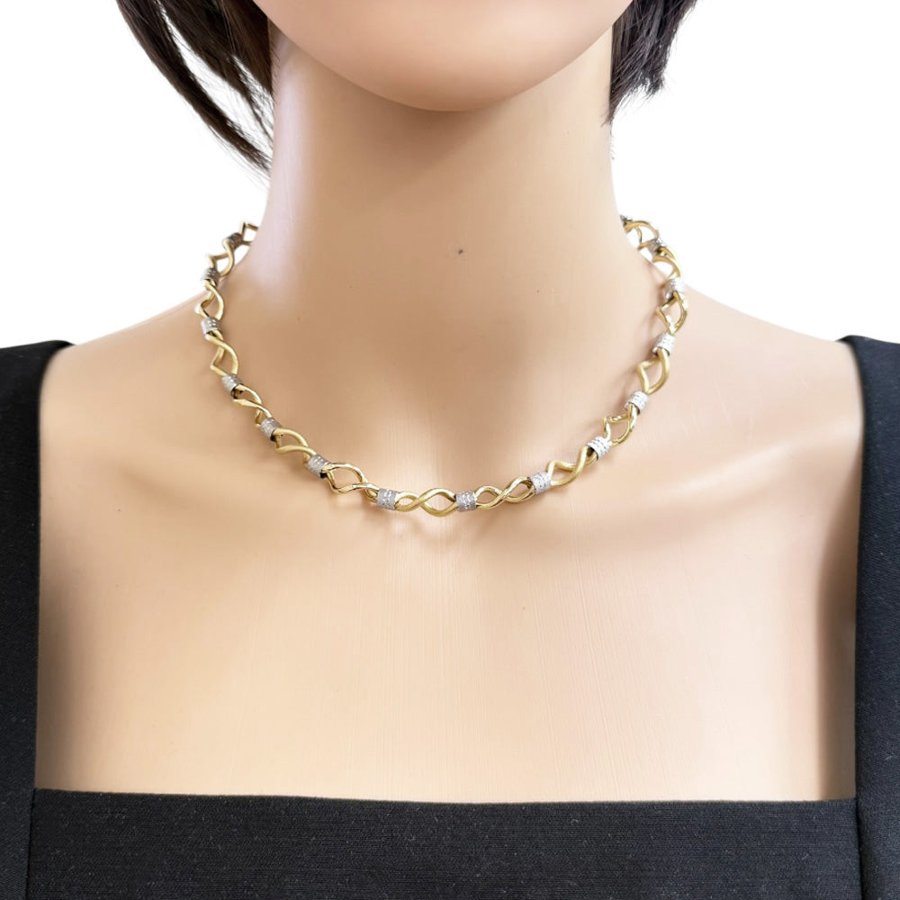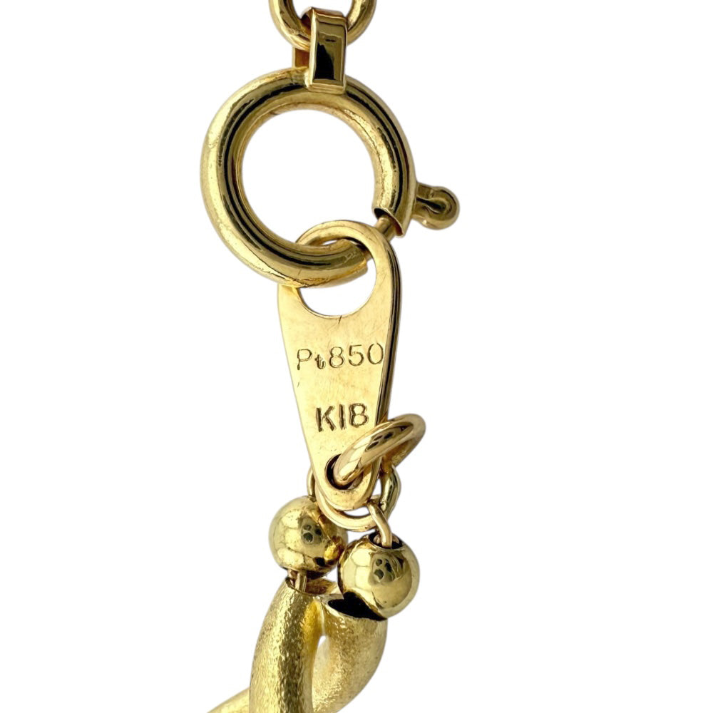 イエローゴールドとシルバーの2色が織りなすユニークなデザインが魅力のネックレスです。洗練されたスタイルで、首元に華やかなアクセントを添えます。