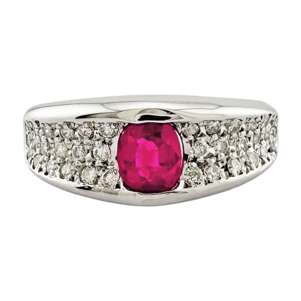 鮮やかなルビーの赤と、それを引き立てるきらめくダイヤモンドが贅沢に配されたプラチナリング。指元に華やかさと品格を添え、特別な日の装いを一層引き立てます。洗練されたデザインが、あなたの個性を輝かせます。