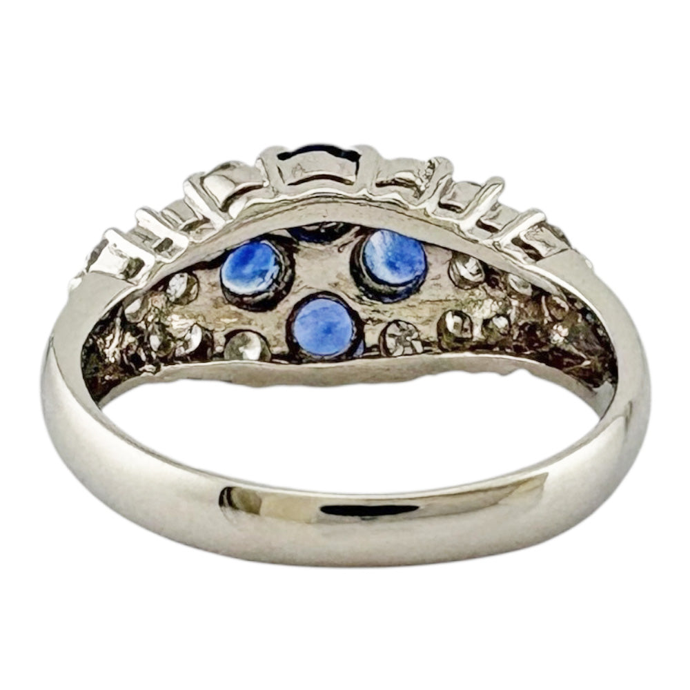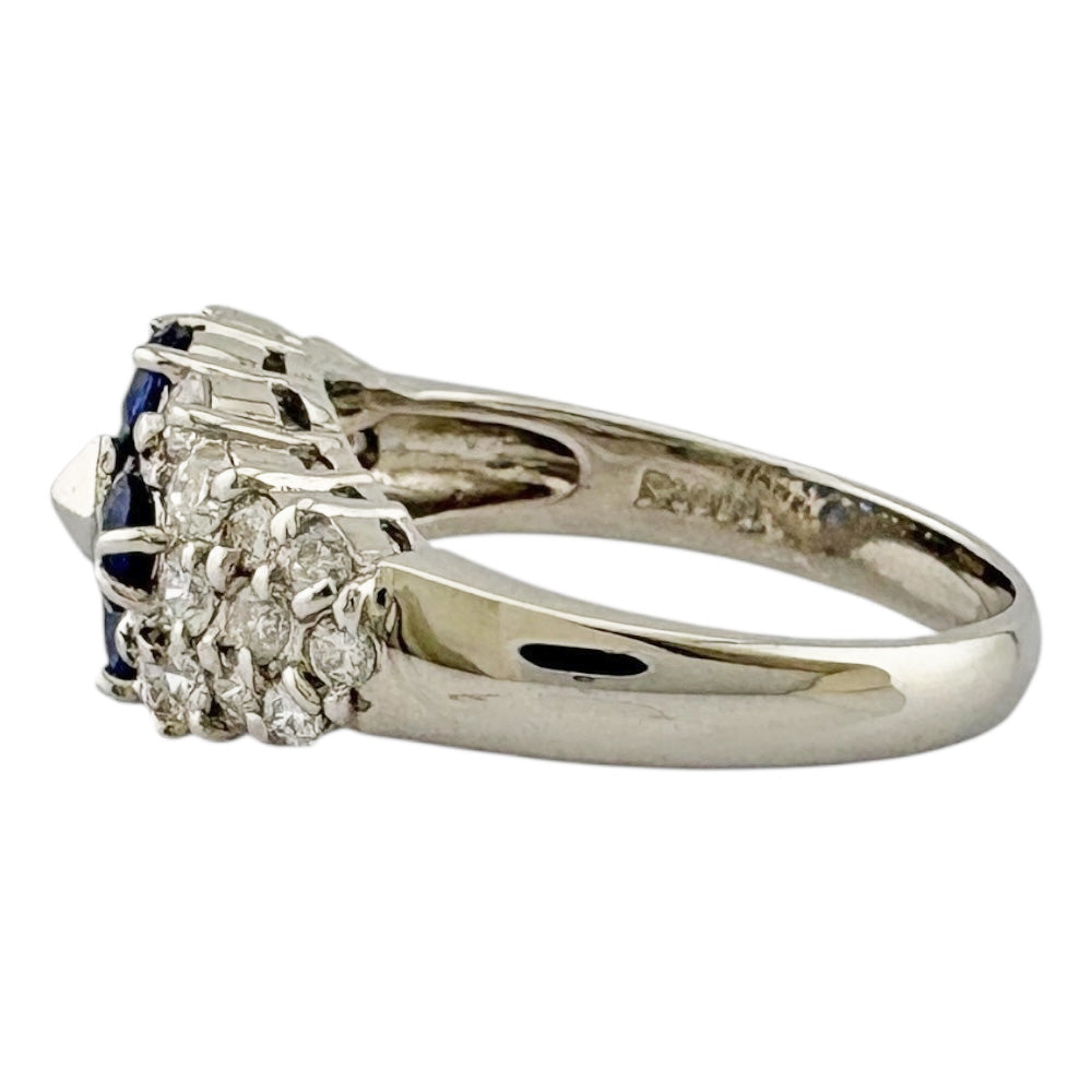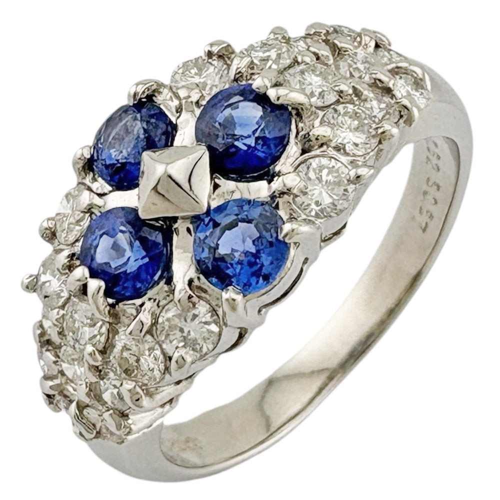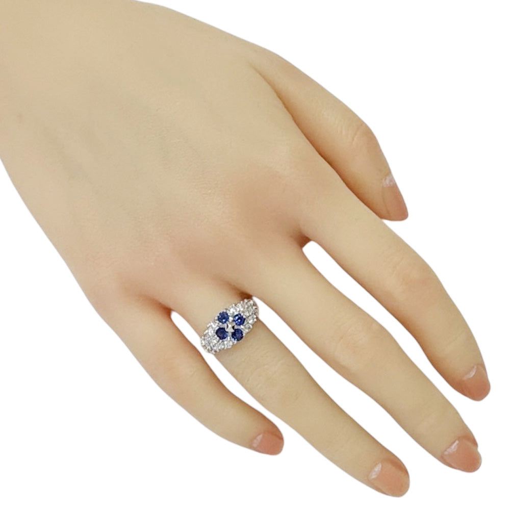 深いブルーのサファイアと煌めくダイヤモンドが贅沢に配された、華やかなリングです。プラチナの輝きが、手元を一層引き立て、洗練された印象を与えます。